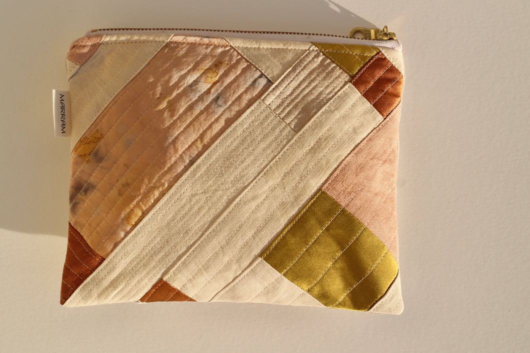 One of a kind improv patchwork zipper pouch. Pieced with scraps of our naturally dyed linen along with vintage hemp and unbleached linen.