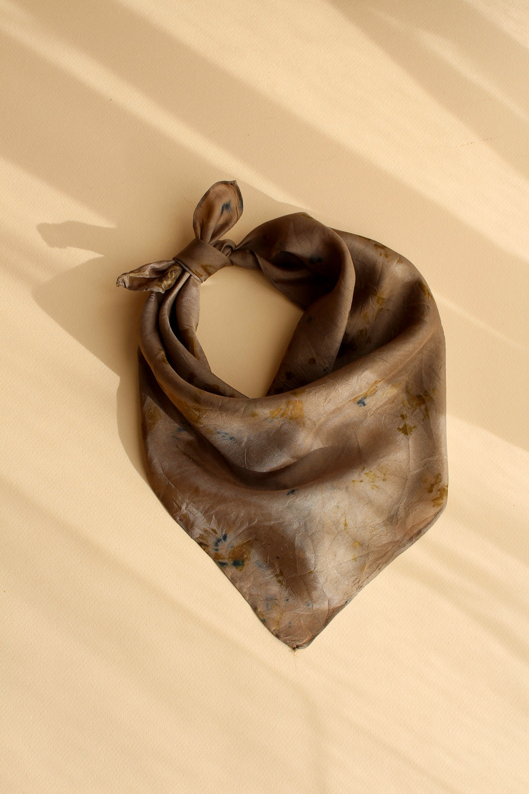 The silk has been hand dyed using a combination of plants, flowers, food waste  and natural dye extracts to create a unique print on the fabric.